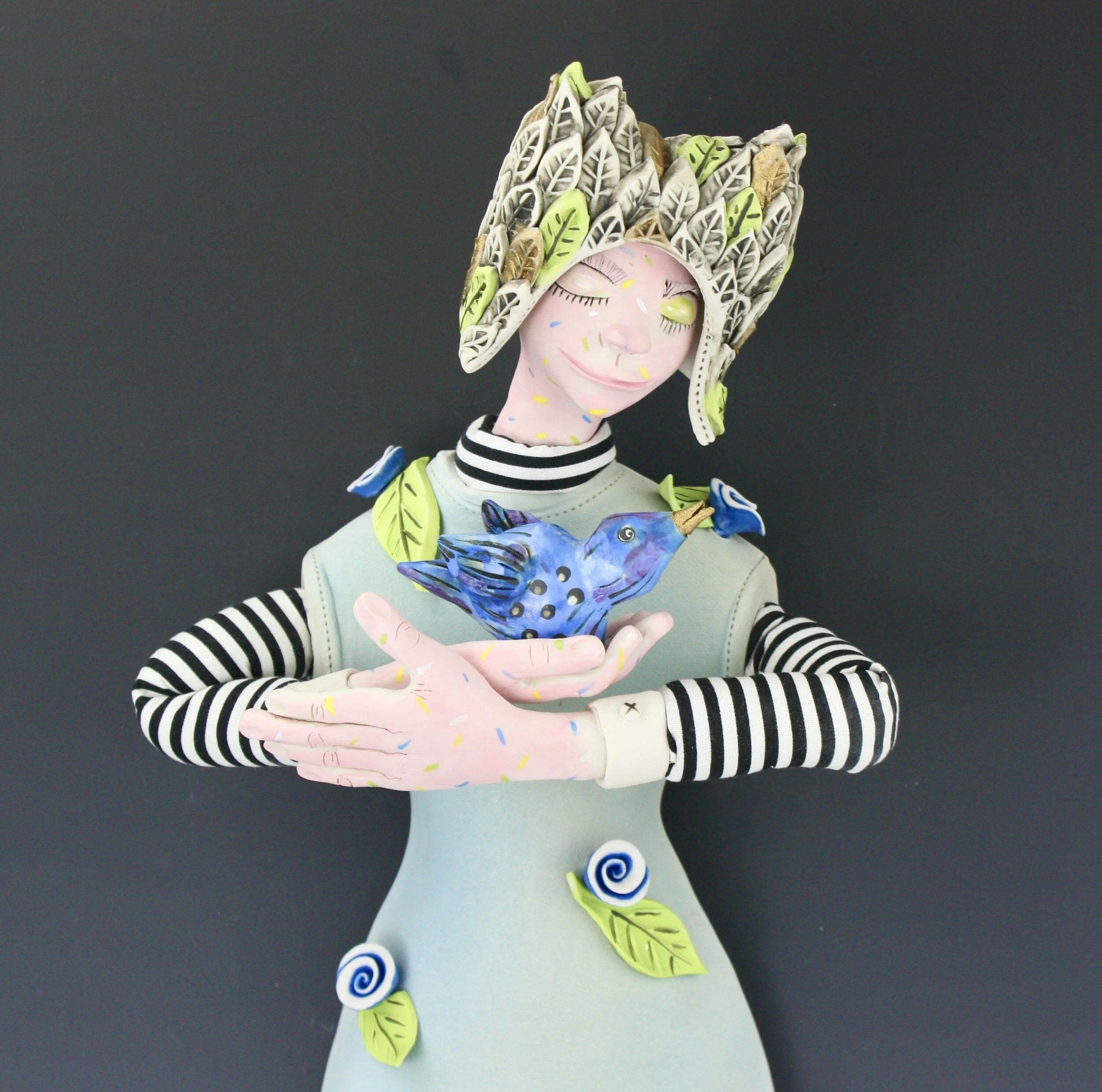 It was love at first touch when I discovered clay and no accident that I immediately noticed the way this wonderful material could be made to resemble fabric. Porcelain is my clay preference, so well suited to the delicate textures and colors I enjoy. Using slab or pinch construction I imprint canvas and other fabric patterns on the clay. Dressmaking tools and press molds of buttons and other simple objects add realistic detail. Color is applied in all stages of the process. I am forever in pursuit of a new thing that helps give the appearance of time’s passing.